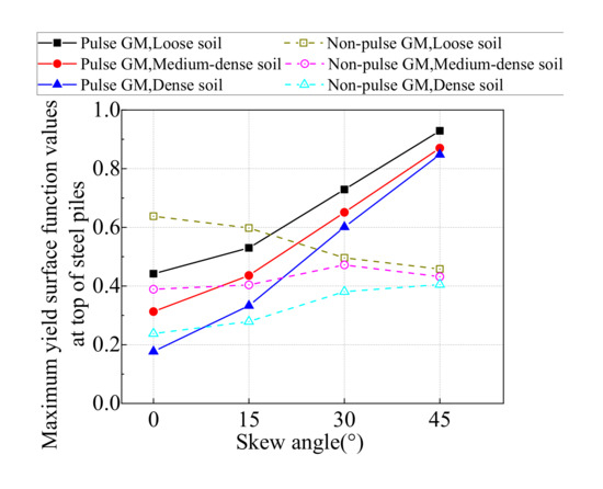 - Under non-pulse type ground motions, the yield surface function value as well as the maximum normal stress on the steel pile cross-section decrease with the backfill compactness, and increase with the skew angle for densely compacted backfill. Under pulse type ground motions, the value still decreases with the backfill compactness, but it consistently and sharply increases with the skew angle for all types of backfill. The near-fault effects significantly increase the yield surface function value as well as maximum normal stress in steel piles, and amplify the influence of the skew angle.