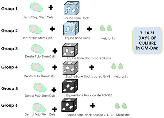 - Group 6: hDPSCs + equine bone block G-N-coated 10 μg/mL + melatonin (G-N10 + Mel).