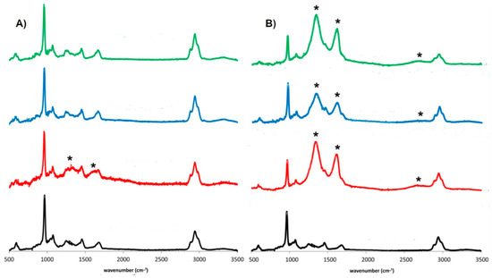 Raman spectroscopy of collagenated blocks coated with graphene-oxide (G-N) at concentrations of (A) 2 (G-N2) and (B) 10 μg/mL (G-N10). The black spectra correspond to the uncoated bone block. The red, blue, and green spectra correspond to spectra recorded in three different points of the G samples. The Y-axis represents Raman intensity in arbitrary units, whereas * refers to recognized graphitic material bands (i.e., the G band at 1580, the D band at 1350, and the 2690 cm−1).