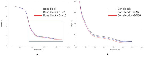 Thermogravimetric analysis (TGA) analysis of an uncoated bone block (black line) and bone blocks coated with G-N at concentrations of 2 (blue line) and 10 μg/mL (red line). (B) is the enlargement of the squared spectra of (A).