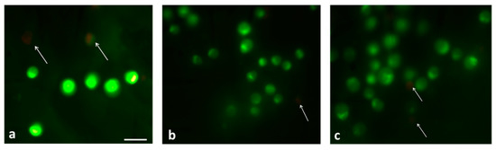 Images of human dental pulp stem cells (hDPSCs) seeded on equine bone blocks, uncoated (a), G-N2 (b), and G-N10 (c), acquired with a fluorescence microscope (40·), scale bar 50 µM. The pictures show that cells are mostly alive (green spots) after 24 h, while only few of them, indicated by the arrows, are dead (red spots). The evaluation of the hDPSC viability was assessed using the live/dead test (Live/Dead BacLight™, Molecular Probes, Eugene, OR, USA).