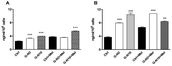 The Software StatPlus6 (Analystsoft, Walnut CA, USA) was used for data analysis. Parametrical methods were used after having verified the existence of the required assumptions. The factors under investigation were the time elapsed, the presence of G-N2 and G-N10, and their combination with melatonin for genes and miRNAs expression levels. Data were expressed as means and standard deviation of the recorded values obtained from 3 different experiments. The statistical significance among multiple samples was determined with the one-way ANOVA analysis of variance with Bonferroni’s multiple comparison tests and Tukey’s multiple comparison tests. All statistical tests were performed via GraphPad Prism Software, version 7 (GraphPad Software, La Jolla, CA, USA).