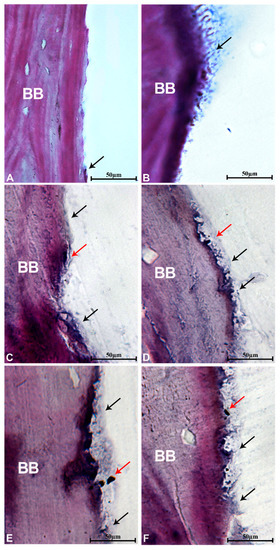 (A–F) Histological evaluation: (A) Histologic section of bone block (B) seeded with hDPSC. The sample showed a discontinuous cell layer (arrow) (toluidine blue and acid fuchsin, 1000×). (B) Histologic section of bone block (B) seeded with hDPSC and melatonin. The sample showed a continuous cell layer (arrow). (Toluidine blue and acid fuchsin, 1000×). (C) Histologic section of G-N2-coated bone block (B) seeded with hDPSC. The sample showed a discontinuous cell layer (black arrows); in a small portion, a residue of graphene G-N2 (red arrow) was detected. (Toluidine blue and acid fuchsin 1000×). (D) Histologic section of G-N2-coated bone block (B) seeded with hDPSC and melatonin. The sample showed a continuous cell layer (black arrows) and in one point a thick residue of G-N was observed (red arrow) (toluidine blue and acid fuchsin, 1000×). (E) Histologic section of G-N10-coated bone block (B) seeded with hDPSC. G-N particles (red arrow) appeared both in contact and distant from the block surface. In some areas (black arrows) cells on the surface could be observed. (Toluidine blue and acid fuchsin, 1000×). (F) Histologic section of G-10-coated bone block (B) seeded with hDPSC and melatonin. G-N particles were present in contact (red arrow) with the surface and a thin cellular layer (black arrow) on the surface was present (toluidine blue and acid fuchsin, 1000×).