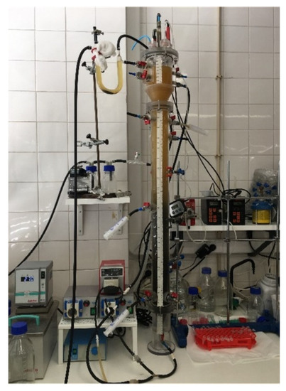A lab-scale expanded granular sludge bed reactor (EGSB) with a working volume of 3 L (internal diameter of 5 mm and height of 153 cm) was operated under anaerobic conditions (Figure 1).