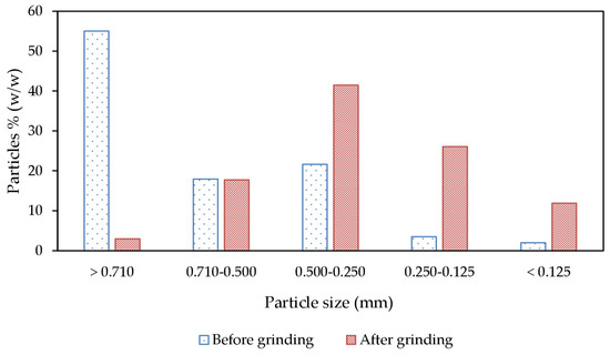 A grinding step was applied to the dried BSG aiming at reducing the particle size, thus improving the particle surface area per unit volume. This facilitates the contact of the acid with the particles and boosts the rate of acidic hydrolysis [11]. Results show that the BSG average particle-size was clearly reduced, with around 80% (w/w) below 0.5 mm (Figure 2).