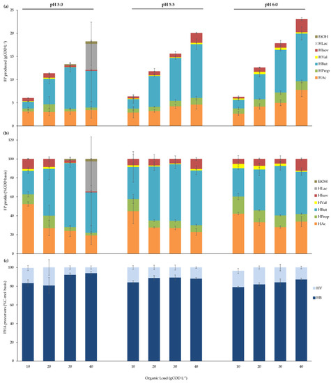 The produced organic acids can be used as building blocks for polyhydroxyalkanoates (PHA) production. The PHA monomeric composition is directly related to the FP used as substrate. In general, hydroxybutyrate (HB) monomers are synthetized from HLac, HAc and HBut, while hydroxyvalerate (HV) monomers are produced from HProp and HVal [15,39]. However, the production of other organic acids can promote the synthesis of different homopolymers or copolymers with improved mechanical properties. The homopolymer P(3HB) has a high crystallinity which results in a very low impact strength and brittle failure. On the other hand, the incorporation of HV chains enable to reach a broader processing window and an improved material flexibility, by decreasing crystallinity, melting temperature and glass transition temperature [40]. Having in mind the final application of the biopolymer, it is possible to manipulate the FP composition to achieve the desired properties of the polymer. Based on the FP profile obtained at each pH and OL, the HB and HV monomers were estimated (Figure 3c). The highest content of HB precursors was achieved at pH 5 (87.7 ± 5.6%C-mol basis) while the HV precursors were higher at pH 6.0 (15.9 ± 2.0%C-mol basis). The HV precursors generally increased (from ca. 15.9–17.0, 7.68–15.8, and 5.91–12.7%C-mol basis, at OL of 10, 30 and 40 gCOD L−1, respectively) with pH increase from 5.0 to 6.0 (Figure 3c), except for the OL of 20 gCOD L−1. Thus, operating conditions such as pH and OL can be manipulated to produce the HB/HV precursors accordingly to the target polymer composition considering VFA application in PHA production. On the other hand, in all the conditions tested butyrate was the dominant FP obtained. This acid is considered as the preferred substrate for PHA production since it is more energetically favorable at a metabolic level than other FP [41,42,43]. Thus, from this point of view the butyric acid is beneficial for the process efficiency. Nevertheless, introduction of HV precursors is envisaged if a more flexible/less rigid polymer is required.