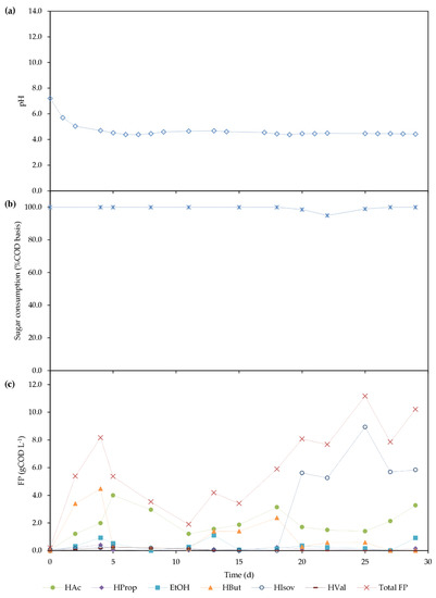 (a) pH variation, (b) Sugar consumption, and (c) Fermentation products (FP) produced during EGSB operation.