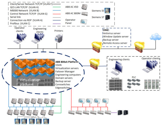 The Iggesund paperboard is a typical process automation factory, and the automation network can be considered as an example of production networks in manufacturing. Reliability of the production network is ensured by hot-standby redundancy consisting of two networks: primary and secondary. The communication backbone for two paperboard machines comprises three marshaling rooms and a number of switches located across the factory. The communication between different systems is provided by the configuration of several virtual LANs (VLANs). This case study covers a part of the operational network consisting of 5 control systems, with 43 stations connected to the server network and 32 process controllers on various VLANs. Figure 1 illustrates the network topology at the paperboard machine where the data were collected. In this study, the Client–Server Network traffic with connectivity to the Internet is considered IT traffic, and the traffic from the control systems is the OT traffic.