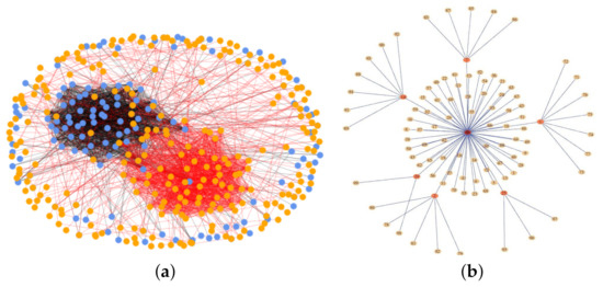 The network comprises 337 devices, and 6,554,498 recorded transmissions were studied for illustrating the results of this experiment. The collected data consist of both IT and OT traffic, with statistics summarized in Table 1. Figure 2a illustrates the connectivity structure of the brown-field that represents the communication between network components; IT and OT traffics are color-coded in blue and orange, respectively. A larger number of packets are transmitted between devices belonging to each of the traffics. Six communication clusters comprise the network, and devices communicate with 1 to 108 peers. That is, the sub-systems have a maximum of 108 communication destinations for both IT and OT. To see the dynamics of the traffic, a 25-min window is illustrated in Figure 3. As expected, OT traffic shows a less volatile data transmission pattern compared to IT traffic. The IT traffic comprises the majority of the transmitted packets as well as the larger bandwidth consumption. The ratio between the number of transmitted packets and the transmitted data indicates that, on average, larger packets belong to IT.