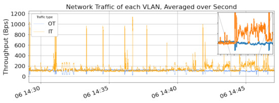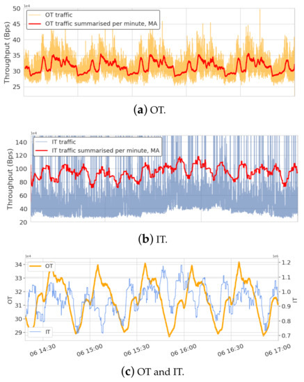 It is also notable that IT dynamics clearly show seasonality and trend, which, when removed, can provide more insight and discussion points to draw a more accurate conclusion. A closer look at the generated throughput dynamic patterns shows some level of similar dynamics in IT and OT behavior, Figure 7c. This similarity can be reasoned with the observed shared traffic between OT and IT in some of the VLANs. As presented in the comparative analysis of volume and dynamic mixture, the assumption of exclusive traffic class and flows patterns based on the pre-defined VLANs does not hold for brown-field traffic, i.e., IT and OT communications are not necessarily isolated in VLANs. The IT–OT flows can potentially show their effect on IT dynamics by similar patterns repeated in longer time intervals. Finding the correlated patterns between IT and OT bandwidth dynamics can further assist in characterizing the IT–OT flows and their requirements in terms of communication intervals and the amount of transmitted data. This insight subsequently can provide a baseline for integrating traffics from new technologies or replaced network components.