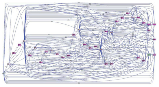 The matrix and dynamic measurement is also a method used for anomaly detection in the network. The dynamics of each pair of communicating components are modeled using various probabilistic and mathematical methods. The initial efforts are to model the dominant communication pattern and classify the future traffic to identify the anomalies or security bridges. Figure 4 illustrates the outcome of applying Discrete Time Markov Chain (DTMC) to model communication between a pair of components, associated with the connectivity structure in Figure 2a. The model is applied on 40,000 packet results in 37 states and 277 transitions [7].