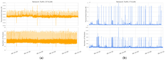 Traffic dynamics in the network for transmitted data and the number of transmitted packets in OT-VLAN (a) and in IT-VLAN (b).