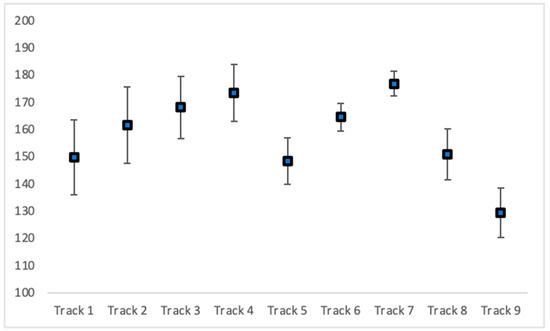 Figure 1 shows the heart rate average of the participants in each of the tracks. It is observed how the intensity increases progressively in the first four tracks. A decrease in the average heart rate is observed during tracks 5 and 8, which correspond to “recovery” and “conditioning”, respectively. The highest average heart rate was recorded on track 7, corresponding to “max jump 2”. Finally, the lowest average heart rate values were recorded on the last track, where the cooldown was performed.
