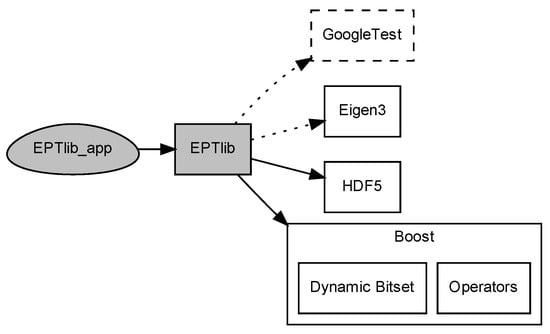 The library has some external dependency, as depicted in Figure 1. In particular, EPTlib depends privately on the interface library Eigen 3 (https://eigen.tuxfamily.org), for linear algebra computations, and publicly on the library HDF 5 (https://www.hdfgroup.org/solutions/hdf5), for the input and output of datasets, and on the libraries Dynamic Bitset and Operators of the collection Boost (https://www.boost.org), for handling binary maps. Optionally, EPTlib uses the framework GoogleTest (https://google.github.io/googletest) for unit testing.