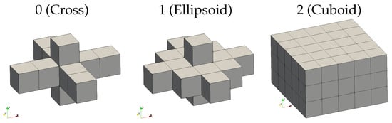 Figure 3. Savitzky–Golay filter windows of different shapes assuming a size equal to [2,2,1]. - shape is an integer value that selects the shape of the filter window: 0 for a cross, 1 for an ellipsoid and 2 for a cuboid (cf. Figure 3). By default 0.