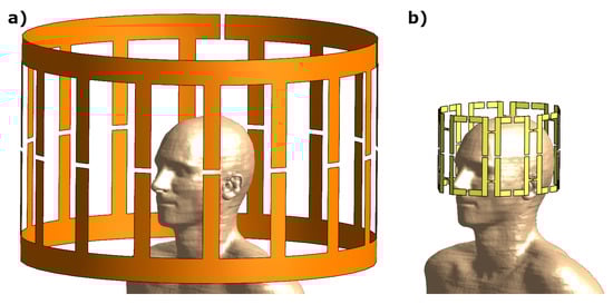 The implemented Helmholtz-EPT and convection-reaction-EPT techniques were applied on virtual data obtained from the simulation of a low-pass 16-leg birdcage body-coil (radius = 36 , height = 45 ). The body-coil was used both in transmission and in reception with polarization switch. The gradient-EPT technique, instead, was applied on data from the simulation of a 7 8-channel head-coil made of eight loops arranged elliptically [47] (height = 16 , semi-axes = and ). The same head-coil was used in transmission and reception and the raw data acquired by the eight channels were combined according to a circular polarization. Both the coil models were used to perform head imaging of the anatomical human model Duke [48], as illustrated in Figure 4.