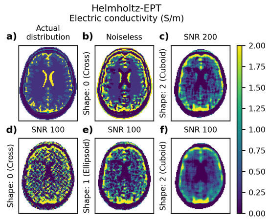 Electric conductivity distributions recovered by complete Helmholtz-EPT. (a) Actual distribution at 64 in the considered section. (b) Distribution recovered from noiseless input with a cross window of size [1,1,1] for the Savitzky–Golay filter. (c) Distribution recovered from input with SNR 200 using a cubic window of size [2,2,2] for the Savitzky–Golay filter. (d–f) Distributions recovered from input with SNR 100 using windows of size [3,3,3] and different shapes (cross, ellipsoid and cuboid, respectively) for the Savitzky–Golay filter.