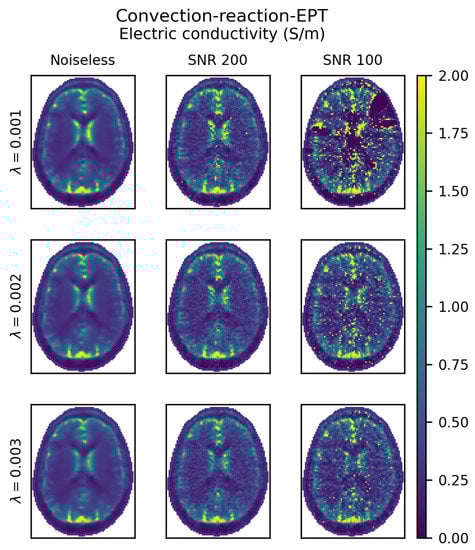 When the input data were noisy, the conditioning of the problem at the basis of convection-reaction-EPT worsened, making its resolution more time-consuming and affecting the quality of the result. However, the artificial diffusion term restored the conditioning with a regularization effect that became more relevant when the coefficient increased, as can be observed in Figure 7 for the cases with SNR 200 and, more evidently, with SNR 100. It is worth noting that, differently from the increased windows of the Savitzky–Golay filter used for Helmholtz-EPT, the artificial diffusion term managed the noise propagation without affecting significantly the image resolution. The adoption of a large window for the Savitzky–Golay filter in conjunction with the artificial diffusion regularization could help when dealing with very noisy input data.