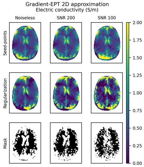 Electric conductivity distributions recovered by the two-dimensional approximation of gradient-EPT, to be compared with the actual distribution at 300 reported in Figure 8. All the distributions are recovered using a cross window of size [2,2,2] for the Savitzky–Golay filter. The seed points selected for the constraint are marked by red dots. The distributions recovered with regularization used a regularization coefficient . The masks adopted for regularization were obtained with a tolerance in the noiseless case, with SNR 200 and with SNR 100. The resulting masks are reported. Results obtained with different amount of noise (noiseless, SNR = 200 and SNR = 100) were collected.