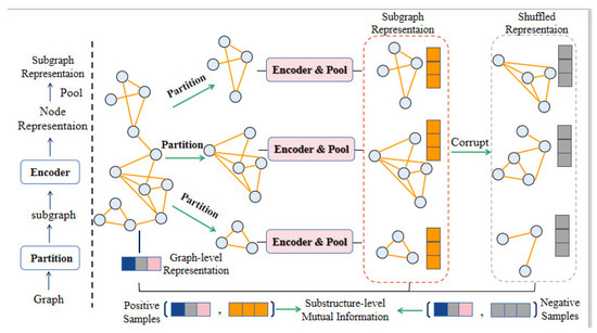 For the k-th subgraph, we take as a positive sample and as a negative sample, where is a subgraph representation in which nodes are randomly selected from other graphs. The detailed process of retaining the sub-structure mutual information is shown in Figure 3. In detail, for the k-th subgraph representation, our corruption function shuffles the other nodes and select k nodes randomly to obtain the negative subgraphs . Then we obtain the substructure-level representation of negative samples.