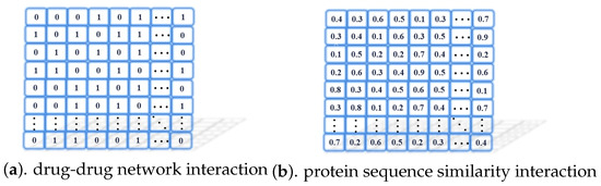 We used datasets that were compiled in previous studies. We give the source of the data used in the section Data Availability Statement in the article. We describe the data in detail. The drug-drug relational network, i.e., mentioned in the model and protein sequence similarity are shown in Figure 4. 1 means known interaction, 0 means unknown interaction.