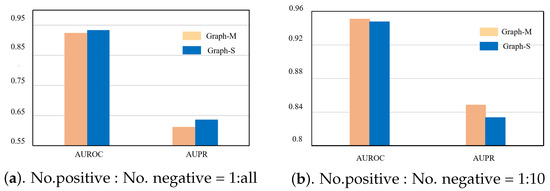 Our method uses the mutual information between the substructure and graph-level representations and the mutual information between the node–level and graph–level representations. It can be observed that the mutual information between the substructure and graph-level representations contributes more to the mutual information in a relatively sparse network. In a relatively dense network, the node–level and graph–level representations contribute more to the mutual information (see Figure 6).