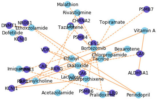 Network visualization of the top 30 novel drug–target interactions predicted by GraphMS. Purple and blue nodes represent proteins and drugs, respectively. solid and dashed lines represent the known and predicted drug–target interactions.