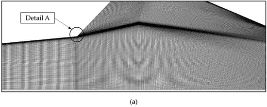The sample of the chosen mesh (medium mesh) around the exit of the primary nozzle as well as the inlet of the secondary flow is shown in (a) and the “Detail A” is shown in (b).