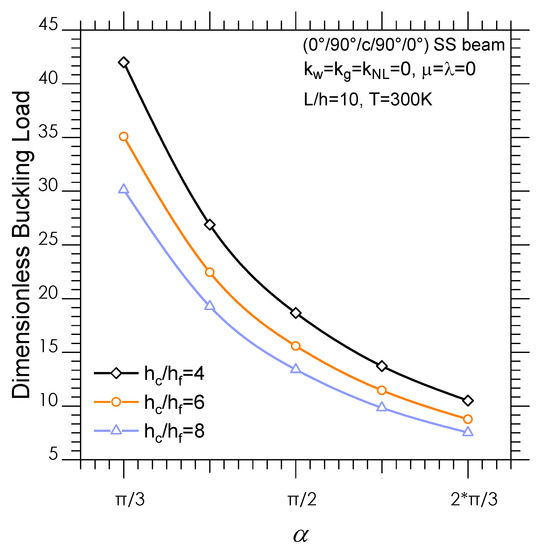 In Figure 4 the critical buckling load versus the opening angle is illustrated, taking into account the core-to-face sheet thickness ratio variation. A clear reduction of the beam stiffness with an increased core layer can be observed for each fixed opening angle, which is even more pronounced for lower values of the opening angles.