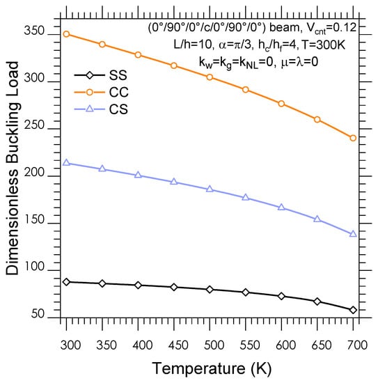 Dimensionless buckling load versus temperature.