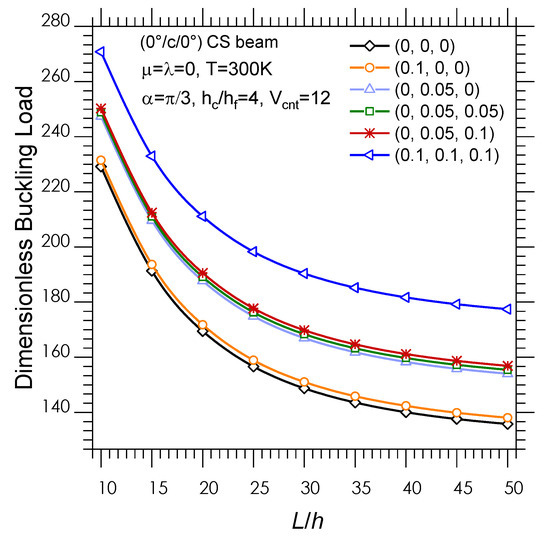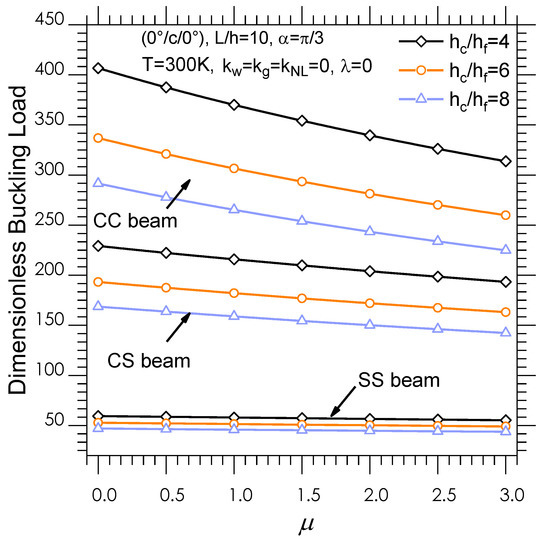 Comparisons of dimensionless critical buckling loads for FG-CNTRC straight beams hc/hf, .
