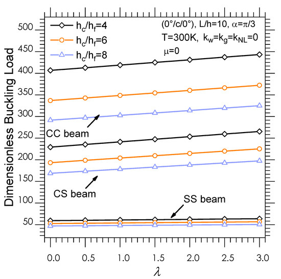 Figure 5 also shows the double effect of the core-to-face sheet thickness ratio and CNT volume fraction on the dimensionless buckling load, with a clear shift of the curve upwards for increasing values of . The highest critical buckling load is reached for a volume fraction , where the lowest stability is observed for . The impact of the thermal environment on critical buckling load is visible in Figure 6, where an increased temperature value leads to a clear reduction in the buckling load for all the selected boundary conditions because of the thermal dependence of the mechanical properties of the materials. As also expected, the highest stability is reached by CC sandwich beams, independently of the thermal environment. The further effect of nonlocal and length scale parameters on the critical buckling load is also plotted in Figure 7 and Figure 8, respectively. One can easily note that the buckling load increases by decreasing the nonlocal parameter and by increasing the length scale parameter, in line with the information in Table 7. Unlike the length scale parameter , an increased nonlocal parameter leads to a stiffness reduction of CNTRC laminated nanobeams. The critical buckling load versus the thickness ratio is finally illustrated in Figure 9 by assuming different elastic foundation parameters. An increased thickness ratio leads to a monotone reduction of the buckling load, with a meaningful effect of the shear foundation parameter on the buckling results.
