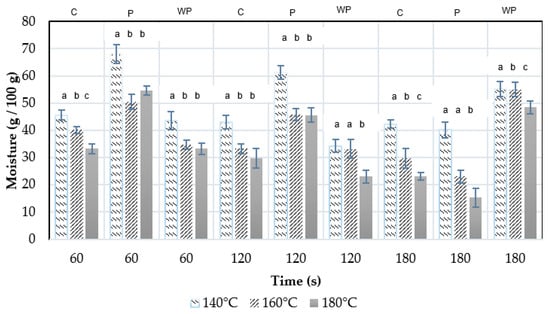 Moisture loss during frying of cassava chips at different temperatures and times: The first column indicates the control sample (C), the second column indicates that pectin (P) was used, and the third column indicates that whey protein (WP) was used. Different letters indicate statistical differences (p < 0.05) for the same frying time at different temperatures.