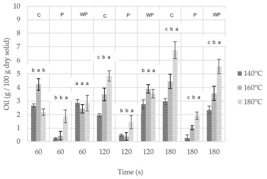 When analyzing the oil absorption at 60 s, no statistical differences were observed in the whey protein coated chips, but differences were observed in the pectin-coated chips at 180 °C and in the control at 140 °C (p < 0.05) (Table 3). At 120 s, the most representative differences were evidenced in the control at all process temperatures; this was also observed at 180 s in the pectin-coated chips, the control, and the whey protein-coated chips at different temperatures. When analyzing coating type, the control and whey protein-coated chips presented 321% more oil content on average at 180 °C and 180 s than the pectin-coated chips (Figure 2).