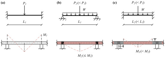 The main beam or double-beam can be idealized according to the boundary conditions and load conditions. As shown in Figure 3a, the main beam of the GBG system can be idealized as a beam that receives a concentrated load in the center with a fixed end condition because the connection of the GBG is designed as an idealized rigid connection. Since the connection of the DBX system is a bolted connection with ideally no rotational constraints at the ends of the double-beam, the double-beam in the DBX system can be thought of as a simply supported beam receiving a uniformly distributed load and a concentrated load, as shown in Figure 3b. The boundary condition at the ends of the double-beam in the DBO system can be idealized as a fixed-end condition if the rotational constraint of the beam-ends is secured large enough. While the load conditions of the double-beam in the DBO and DBX systems are identical, the rotational constraints from the concrete panel can significantly reduce the positive moment demand of the double-beam in the DBO system by generating the negative moment at both ends and shortening the effective length, as shown in Figure 3c. In other words, the addition of concrete panels to the double-beam can realize an economic design of the steel double-beam floor system.
