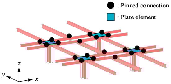 The stiffness ratio of the connection is defined as Equation (4). As shown in Figure 5, the connections between the double-beam and main beam were modeled as an idealized pinned connection without the rotational constraints; that is, the rotational stiffness of the connections (KR) was generated by the flexural stiffness of the concrete panel (KP), which is defined by Equation (5) according to the Kirchhoff–Love plate theory.