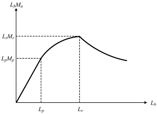 By multiplying the unbraced length of each member (Lib) to the denominator and numerator on the left side of Equation (9), Equation (10) is yielded. Herein, LbMn is named as the LM index. Figure 6 shows the LM index for hot-rolled H-beam according to the unbraced length. Since the LM index has a unique characteristic of having a maximum value in Lr, it can be defined as an index representing the properties of the H-beam. Using this unique characteristic, the LM index in terms of capacity (LMC) is defined as Equation (11). The LM index in terms of demand (LMD) is defined as Equation (12).
