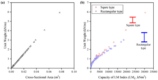 Unit weight of hot-rolled H-beam: (a) Cross-sectional area vs. unit weight and (b) capacity of LM index vs. unit weight.