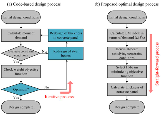 Figure 8a shows the optimization process using a code-based design method. After calculating the moment demand by structural analysis for the initial design conditions, the objective function is calculated from the cross-sectional area of the designed H-beams if the constraints for Equations (8) and (9) are satisfied. If the constraints are not satisfied, the steel beams are redesigned, which leads to the redesign of the concrete panel. On the other hand, as summarized in Figure 8b, the proposed optimal design method does not require an iterative process in quantity optimization. After deriving the H-beams satisfying the constraint conditions for Equations (14) and (15), the sections of the H-beam minimizing the objective function in Equation (13) can be directly selected without repetition. Finally, the optimization process is simply completed by calculating the thickness of the concrete panel based on the moment of inertia of designed H-beams.