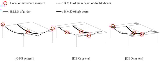 To quantitatively analyze the reduction in the moment demand induced by the rotational constraint, the moment demands by the floor loads were compared between the GBG, DBX, and DBO systems. The moment demand in the main beam of the GBG system for an arbitrary floor load of w (kN/m2) is calculated by Equation (1). The moment demands in the double-beam of DBX and DBO systems are determined using Equations (2) and (3), respectively.