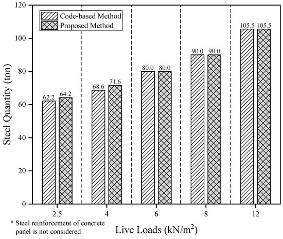 Figure 10 shows the comparison of the total material quantity of steel members designed by the code-based method and the proposed method according to the level of live load considered for the DBO system. Overall, the material quantities derived by the two design methods were similar. In particular, when the live load was lower than 4.0 kN/m2, the design proposal derived by the proposed method showed higher material quantity than that of the code-based method. At relatively low live loads, since the Mn of the H-beam optimized by the LM index tended to be slightly larger than Mu, the design proposal by the proposed optimal design method was analyzed to evaluate the material quantity somewhat higher than the code-based method. This is because the Lr of the optimized section at low live loads was shorter than that of the Lb, so that the section, satisfying the safety-related constraint conditions of the code-based method, did not satisfy the safety-related constraint conditions of the proposed method. For live loads of 6, 8, and 12.0 kN/m2, the material quantities derived by the two design methods were equal to 80.0, 90.0, and 105.5 ton, respectively. Therefore, the proposed design method yielded a quantity-optimized design proposal similar to the code-based method while avoiding a time-consuming iterative process.