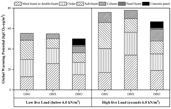 Figure 11 shows the comparison of GWP normalized to the floor area at low live load (below 6.0 kN/m2) and high live load (exceed 6.0 kN/m2) for each structural system. While the DBX system had a slightly smaller GWP value than the GBG system due to the decrease in the material quantity of sub-beams at low live load, the GWP value of the DBX system increased more than the GBG due to the increase in the material quantity of double beams at high live load. The DBO system exhibited the smallest GWP value compared to the other two structural systems at all live loads. The reason that the GWP value of the DBO system was the smallest is that the rotational constraint induced by the concrete panel greatly influenced the reduction of GWP value in the double-beam. The structural characteristic such as the rotational constraint could improve environmental performance, and the GWP value of the DBO system was 13.1% smaller than the GWP value of the GBG system at high live loads. In other words, the steel double-beam floor system improves environmental performance by adding concrete panels to buildings that require a high live load. In addition, the proposed optimal design method can be effectively used in the optimization process of the material quantity requiring for evaluation in environmental performance.