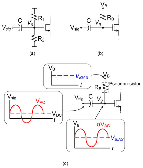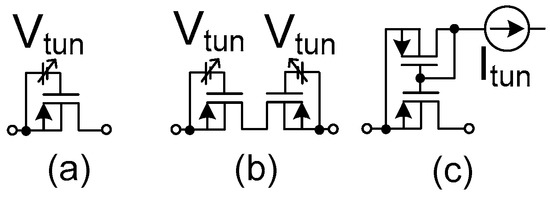 Some applications require tunable pseudo-resistors, where tuning can be achieved using a DC voltage [8,12] or a DC current [13], as shown in Figure 3. Further details and examples of pseudo-resistors can be found in [8].