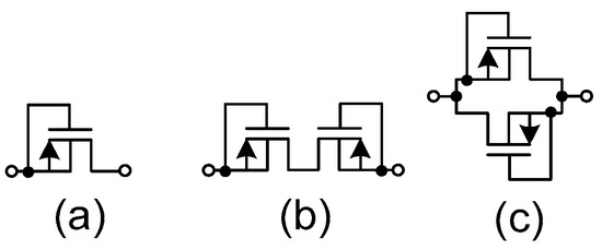 The simplest pseudo-resistor is a diode-connected PMOS transistor operating in deep subthreshold, as shown in Figure 2a [5,35,36]. It is very compact, but the resistance obtained cannot be modified once fabricated, and it is very sensitive to PVT variations. Moreover, the I–V characteristics are asymmetric, so it becomes nonlinear for large voltage swings. These drawbacks are usually of minor concern when the pseudo-resistor is used in high-gain amplifiers operating in negative feedback, as long as the resistance remains high enough for the QFG transistor to process the lowest frequency of the input signal Vsig in Figure 1c. When symmetric I–V characteristics are required, elementary devices can be mirrored either in series or in parallel, as shown in Figure 2b,c, respectively, for the case of two elements [8]. The series connection is useful when large resistance values for wide voltage ranges are needed.