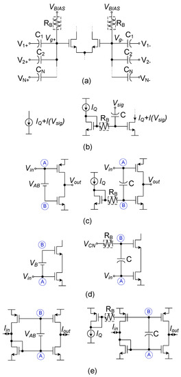 Efficient AC-coupled amplifier implementations can be made using QFG input transistors, as shown in Figure 5 [5,6]. The circuit of Figure 5a can be used for singled-ended input and output, while Figure 5b provides single-ended output for differential inputs. The circuits of Figure 5c,d are fully differential topologies. Note that one (Figure 5a) or two (the other topologies) two-input QFG transistors are employed at the amplifier input. The QFG input capacitor C1 goes to the input terminal, and the other QFG input capacitor C2 is connected to the output. The midband gain is, in all cases, C2/C1. Note that the QFG pseudo-resistor is connected to the output in Figure 5a–c to provide DC-negative feedback. This is not the case in Figure 5d, where the amplifier is in open loop in DC. Hence, adequate design is required, in this case, to avoid saturation of the output [5]. An advantage of Figure 5d is that the amplifier DC input VBIAS can be set to a supply rail, so the circuit can work with ultra-low-supply voltages. Another advantage is that the pseudo-resistor experiences little voltage swings, so a simple pseudo-resistor implementation can be used [5].