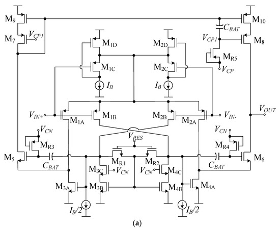 Figure 8a shows the proposed circuit, which is based on a recycling folded cascode topology [70]. The same adaptive bias circuit used in Figure 6b, formed by the FVFs M1C–M1D and M2C–M2D, is employed. In quiescent conditions, M1C–M2C have the same VGSQ as M1A, M1B, M2A and M2B, and, since they have also the same size, neglecting mismatch and channel length modulation, they set a quiescent current IB in M1A, M1B, M2A, and M2B. When a differential signal is applied, the largest (winning) input voltage level shifted by the VSGQ of M1C–M2C appears at the common source of M1A, M1B, M2A and M2B. Hence, currents in these transistors are not limited by IB, due to the large currents that can be provided by the FVFs.