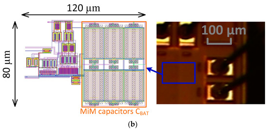 A 130 nm CMOS technology was employed to fabricate a unity-gain, closed-loop version of the proposed super class AB amplifier of Figure 8a. Transistor aspect ratios W/L (in µm/µm) were 72/0.24 (M3A, M4A), 24/0.24 (M5, M6), 12/0.12 (M7, M8), 6/2 (MR1, MR2), 0.5/5 (MR3, MR4, MR5) and 12/0.24 for the rest. Three metal–insulator–metal (MiM) capacitors CBAT of 1 pF were employed. A microphotograph of the circuit is shown in Figure 8b, where the layout plot is also shown, since the surface of the die is opaque.