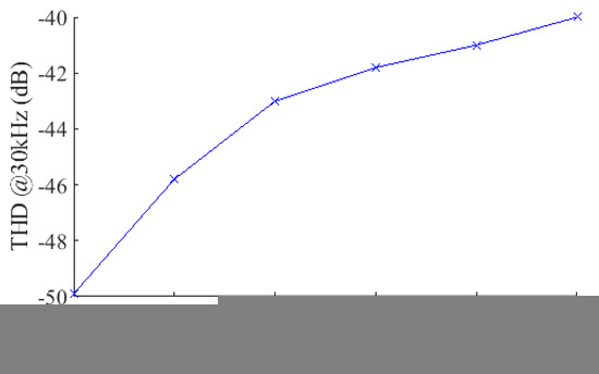 For transient response, the input signal was a 1 MHz 0.4 Vpp square wave, with a −0.2 V DC level generated by an Agilent 33522A arbitrary waveform generator, and the output was displayed in a Tektronix TDS5052B oscilloscope. Total load capacitance was 140 pF. Both the input and transient response are plotted in Figure 10. The measured SR values for the rising and falling edge were 5.7 V/µs and −7.1 V/µs, respectively. Figure 11 shows the measured total harmonic distortion (THD) using a 30 kHz input tone, whose amplitude varies from 100 mVpp to 350 mVpp. Note that THD is below 1% in all this range.