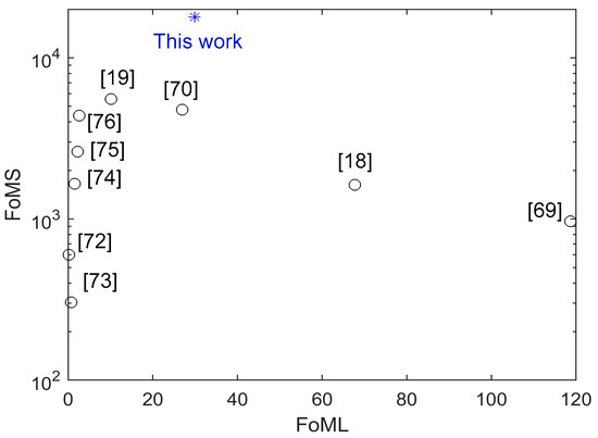 Note that the proposed amplifier showed improved small-signal and large-signal performance just drawing 30 μA from the ±0.5 V power supply. A graphical comparison of FoML and FoMS with different reported amplifiers is shown in Figure 13, where the advantages of the proposed approach are evidenced. Note the good balance between both figures of merit, as deduced from their average value (FoMAVG) in Table 1. The main drawback of the proposed amplifier is the extra silicon area required for the capacitors CBAT, employed for dynamic cascode biasing, as can be seen in Figure 8b.