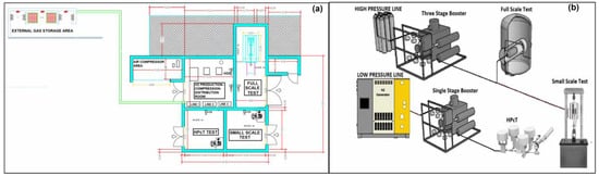 The ∆H lab was built in the frame of the “EOMAT” project (PON03PE_00092_1) funded within of the Italian National Operational Programme ‘Research and Competitiveness’ 2014–2017 [], thanks to a cooperation between Rina Consulting—CSM SpA and University of Calabria. 48The entire construction has been classified as an explosion-proof zone 2 according to the ATEX 2014/34/UE and 99/92/CE directives and so, all the relevant equipment inside the bunker is adequate to this classification. The facility comprises a first H2 production-compression-distribution room, three testing rooms and an external gas storage area. (Figure 1a). The compressor and the test installations are connected to a distribution system composed of high-pressure stainless-steel piping, control valves, pressure and temperature sensors, back-pressure valves, and a burner for venting. The lab presents two separated gas lines (Figure 1b): the first line at high pressure (100 MPa), dedicated to small- and full-scale tests and supplied by ultrapure H2 bundle of bottles, and a second line at 30 MPa, dedicated to tests on SSMs and supplied by an H2 generator. Every line is fed by a specific air-driven booster compression unit, a three-stage and a single-stage compressor for the first and the second line, respectively, so that both testing facilities can simultaneously work with both lines safely. Each room is equipped with gas sensors connected to the lab control systems to operate in a safe condition. In normal operation, the laboratory can run automatically, and the tests are controlled by an operator from a control room near the structure, besides there is the option to accomplish the tests from remote in order to work in full safety.